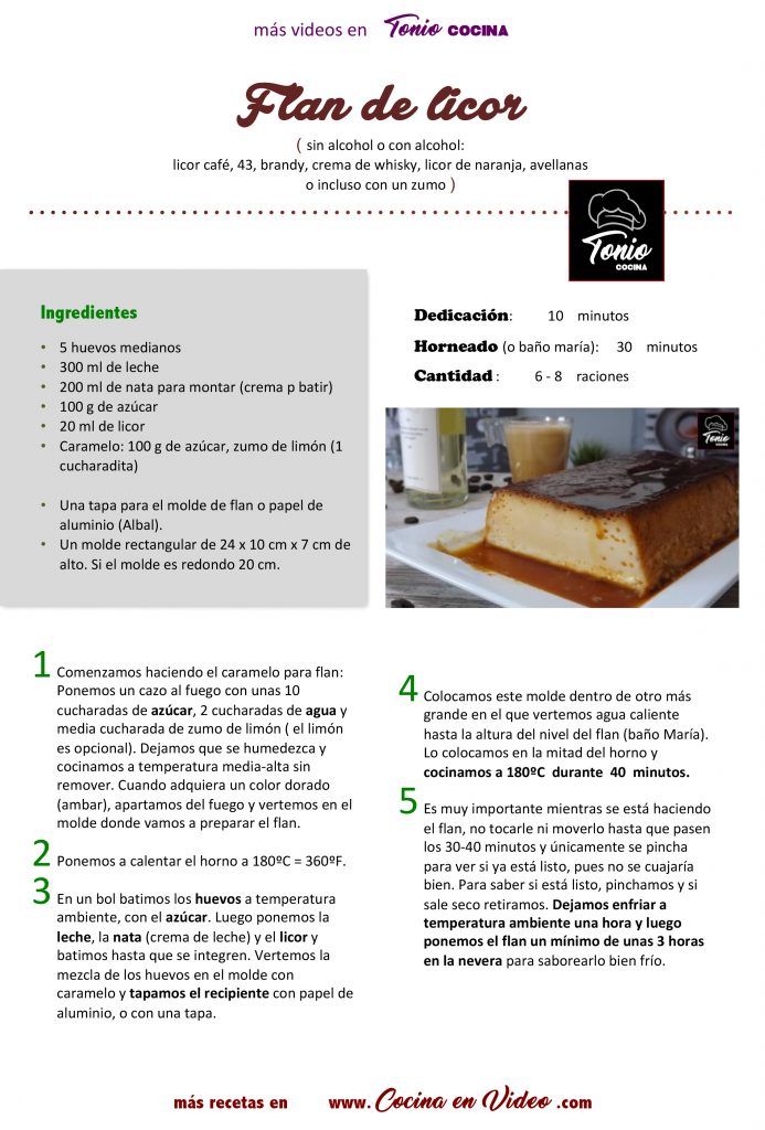 Flan de Licor. Es un rico flan al que puedes dar sabor con el licor que prefieras, sin alcohol o con alcohol: licor café, 43, brandy, crema de whisky, licor de naranja, avellanas e incluso con un zumo. Queda muy suave y lleno de sabor, para disfrutar en cualquier momento.